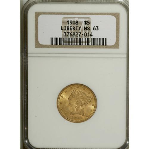 1908 $5 MS63 NGC. NGC Census: (945/878). PCGS Popu