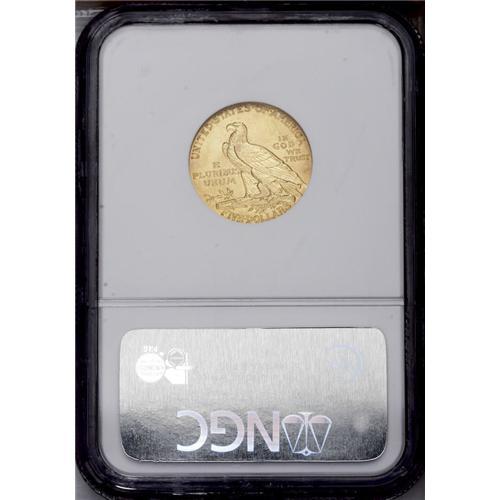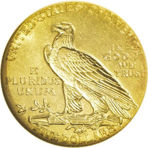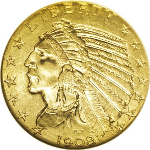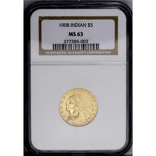 <B>1908<$5> MS63 NGC.</B></I> Well struck with copper-gold color over satiny surfaces. This piece has fewer than expected contact marks for the assigned grade.