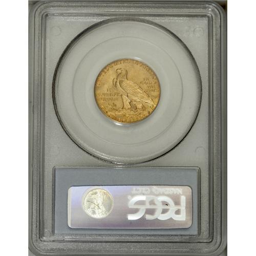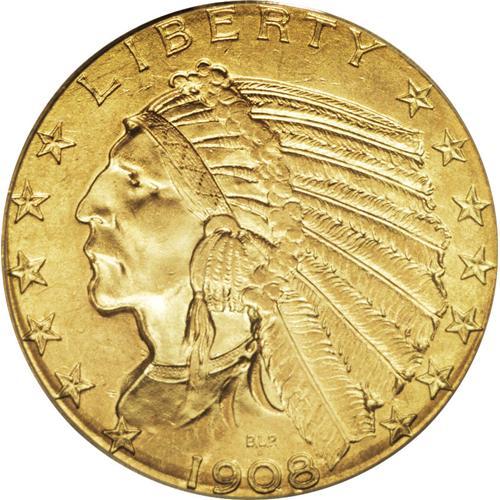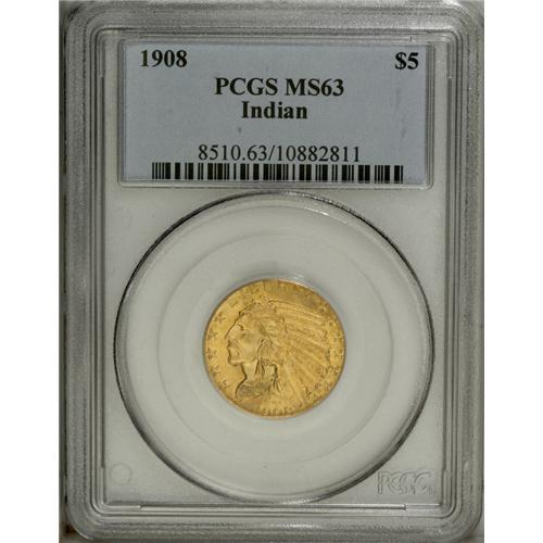 <B>1908 $5 MS63 PCGS.</B></I> A boldly defined and pleasantly unperturbed Indian five with an above average strike for this introductory-year issue. The light lime-green and canary gold tones are original, and further confirm the eye appeal. Gold type coins with full luster and clean surfaces are always under strong demand.<BR><BR><b>Shipping:</b> Coin/Currency (<a target="_blank" href="http://www.heritageauctions.com/common/shipping.php">view shipping information</a>)