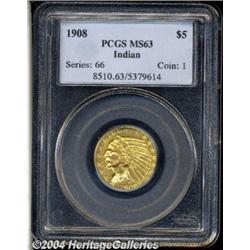 <B>1908<$5> MS63 PCGS.</B></I> This olive-gold representative displays suitably vibrant mint luster for an Indian Five at the Choice BU level. Perhaps limited in grade by some scattered light and moderate grazes. <BR><BR><B>Important notice:</B> Heritage usually auctions material at the rate of 200-250 lots per hour. On some occasions eBay Live bid software or the Internet may not be able to keep up with the pace of the auction. We recommend placing a realistic absentee bid now as insurance to avoid disappointment. Occasionally the auctioneer may eliminate or reject an eBay Live bid, and the auctioneer may also reopen a lot after the close of the eBay live bidding (usually because we missed an audience bid), and may reject your bid even if it shows you as the winning bidder. By bidding via eBay Live, you agree that Heritage may award the lot to another bidder at its sole discretion under the circumstances described above or any other reasonable circumstances. Since eBay bids are not shown to us until we open the lot on the floor, we treat those bids just like floor bids. In most cases the floor responds before the eBay bid is presented to us, due to Internet lag time, so for consistency we have made it a policy that floor bids are always considered first over tie eBay live bids. Also please note that all Heritage lots purchased through eBay Live carry a 20% Buyer's Premium. Please make sure you read the Terms and Conditions before you bid.