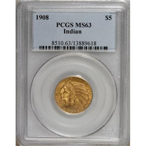 <B>1908 $5 MS63 PCGS.</B></I> Light yellow-gold luster is evident on each side of this sharply defined example. Traces of dark verdigris can be seen within the recesses of the devices.<BR><BR><b>Shipping:</b> Coins & Currency (<a target="_blank" href="http://www.heritageauctions.com/common/shipping.php">view shipping information</a>)