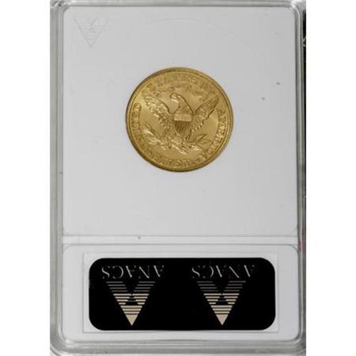 <B>1908 $5 MS64 ANACS.</B></I> NGC Census: (638/257). PCGS Population (628/163). Mintage: 421,874. Numismedia Wsl. Price for NGC/PCGS coin in MS64: $1,390. (#8418)<BR><BR><B>Coin Engraver:</B> Christian Gobrecht<BR><BR><b>Shipping:</b> Coins & Currency (<a target="_blank" href="http://www.heritageauctions.com/common/shipping.php">view shipping information</a>\)