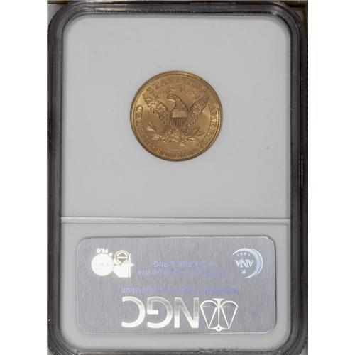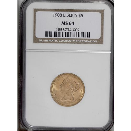 <B>1908 $5 MS64 NGC.</B></I> A boldly struck piece with vivid orange-gold surfaces that sport vibrant luster. Faint abrasions in the fields preclude the higher grade that the eye appeal would suggest.<BR><BR><b>Shipping:</b> Coin/Currency (<a target="_blank" href="http://www.heritageauctions.com/common/shipping.php">view shipping information</a>)