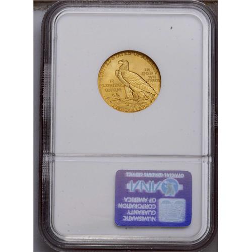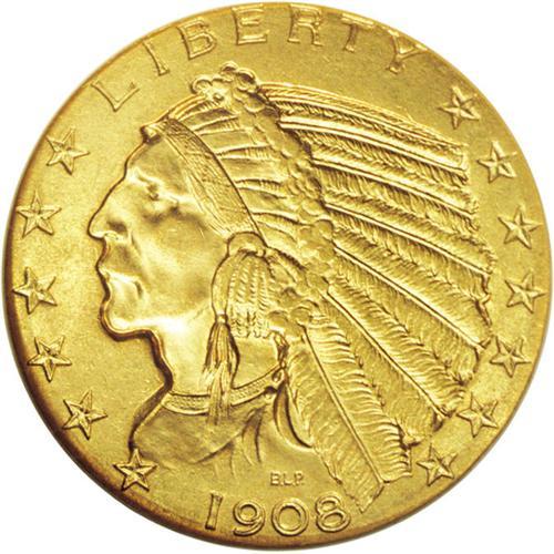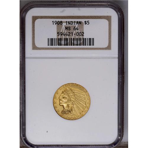 <B>1908<$5> MS64 NGC.</B></I> First year of issue and of enduring interest to collectors for that reason; fortunately, quite a few high grade examples were set aside at the time of issue. This is an especially attractive coin that displays unusually smooth surfaces that are devoid of any meaningful abrasions. The striking details are also impressively well brought up in all areas, including the lowest feather on the headdress. Soft greenish-golden color shows no variation in hue on either side. <BR><BR><B>Important notice:</B> Heritage usually auctions material at the rate of 200-250 lots per hour. On some occasions eBay Live bid software or the Internet may not be able to keep up with the pace of the auction. We recommend placing a realistic absentee bid now as insurance to avoid disappointment. Occasionally the auctioneer may eliminate or reject an eBay Live bid, and the auctioneer may also reopen a lot after the close of the eBay live bidding (usually because we missed an audience bid), and may reject your bid even if it shows you as the winning bidder. By bidding via eBay Live, you agree that Heritage may award the lot to another bidder at its sole discretion under the circumstances described above or any other reasonable circumstances. Since eBay bids are not shown to us until we open the lot on the floor, we treat those bids just like floor bids. In most cases the floor responds before the eBay bid is presented to us, due to Internet lag time, so for consistency we have made it a policy that floor bids are always considered first over tie eBay live bids. Also please note that all Heritage lots purchased through eBay Live carry a 20% Buyer's Premium. Please make sure you read the Terms and Conditions before you bid. This lot is being auctioned in conjunction with a live floor auction by Heritage Galleries & Auctioneers. All final auction and invoice information will be supplied by Heritage Galleries & Auctioneers, and all other information should be considered preliminary. Lot:2864 <BR><BR><B>Winning Notification and Billing:</B> After the FINAL session in this auction is complete, Heritage will send e-mail and snail mail invoices. This process normally takes several days. All final auction and invoice information will be supplied by Heritage Galleries & Auctioneers, and all other information should be considered preliminary. <BR><BR>This auction will be conducted on a live auction floor and over the Internet through eBay Live. If you choose to place an absentee bid, please take a moment to <font color='#0000ff'><u><a href='http://pages.ebay.com/liveauctions/help/before/laabsentee.html'>learn how eBay Live absentee bidding works</a></u></font><font color='#000000'>