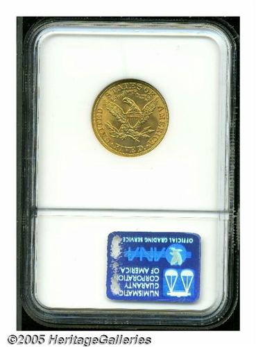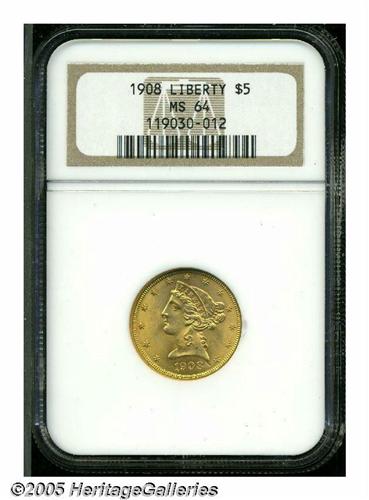 <B>1908<$5> MS64 NGC.</B></I> Sharply struck and lustrous with impressive surfaces for the grade. There is a noticeable strike-through (as struck) to the right of the date.