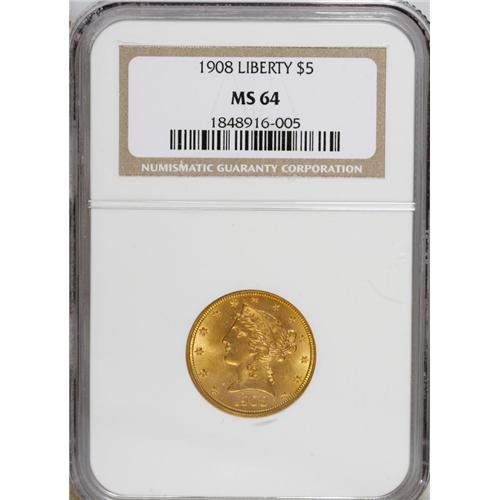 <B>1908 $5 MS64 NGC.</B></I> This boldly struck near-Gem has vivid orange-gold surfaces and vibrant luster. Minimally marked overall, though a handful of small flaws are noted on the cheek.<BR><BR><b>Shipping:</b> Coins & Currency (<a target="_blank" href="http://www.heritageauctions.com/common/shipping.php">view shipping information</a>)