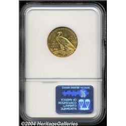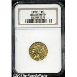 <B>1908<$5> MS64 NGC.</B></I> A remarkable example of this always popular first year of issue for the incuse design Indian Half Eagle. The surfaces are bright and satiny with a light reddish tinge and are remarkably clean for this usually heavily abraded type.<BR><I>From The Greenwich Collection, Part One.</B></I> <BR><BR><B>Important notice:</B> Heritage usually auctions material at the rate of 200-250 lots per hour. On some occasions eBay Live bid software or the Internet may not be able to keep up with the pace of the auction. We recommend placing a realistic absentee bid now as insurance to avoid disappointment. Occasionally the auctioneer may eliminate or reject an eBay Live bid, and the auctioneer may also reopen a lot after the close of the eBay live bidding (usually because we missed an audience bid), and may reject your bid even if it shows you as the winning bidder. By bidding via eBay Live, you agree that Heritage may award the lot to another bidder at its sole discretion under the circumstances described above or any other reasonable circumstances. Since eBay bids are not shown to us until we open the lot on the floor, we treat those bids just like floor bids. In most cases the floor responds before the eBay bid is presented to us, due to Internet lag time, so for consistency we have made it a policy that floor bids are always considered first over tie eBay live bids. Also please note that all Heritage lots purchased through eBay Live carry a 20% Buyer's Premium. Please make sure you read the Terms and Conditions before you bid.