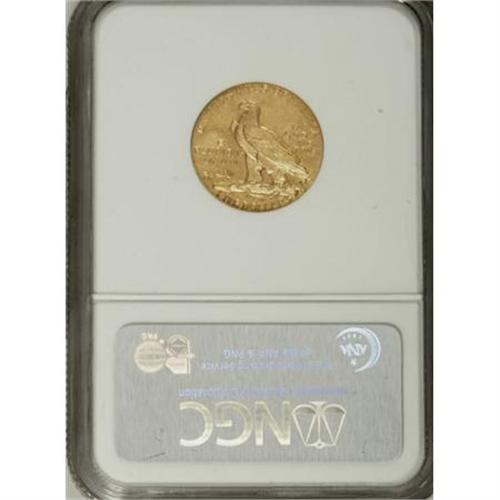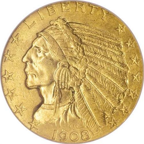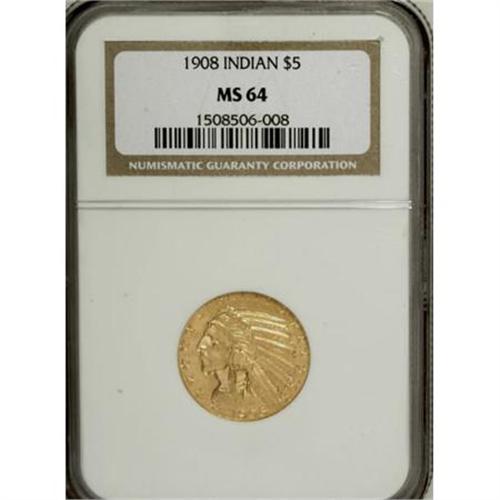 <B>1908 $5 MS64 NGC.</B></I> The 1908 is one of the few Indian half eagles to have a sizable population in Choice, possibly a reflection of the novelty value for this first-year issue. The surfaces of this strongly lustrous piece are orange-gold with occasional lemon-yellow accents. Both sides offer pleasing detail and no individually mentionable abrasions, though each side displays a number of tiny marks. Highly appealing despite these minor flaws.<BR><BR><B>Coin Engraver:</B> Bela Lyon Pratt<BR><BR><b>Shipping:</b> Coins & Currency (<a target="_blank" href="http://www.heritageauctions.com/common/shipping.php">view shipping information</a>\)
