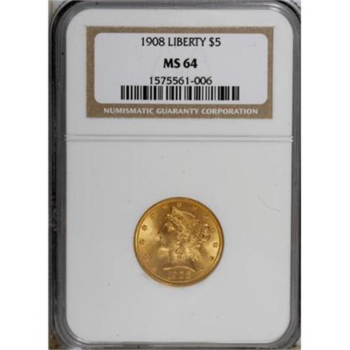 <B>1908 $5 MS64 NGC.</B></I> NGC Census: (637/257). PCGS Population (627/163). Mintage: 421,874. Numismedia Wsl. Price for NGC/PCGS coin in MS64: $1,390. (#8418)<BR><BR><B>Coin Engraver:</B> Christian Gobrecht<BR><BR><b>Shipping:</b> Coins & Currency (<a target="_blank" href="http://www.heritageauctions.com/common/shipping.php">view shipping information</a>\)