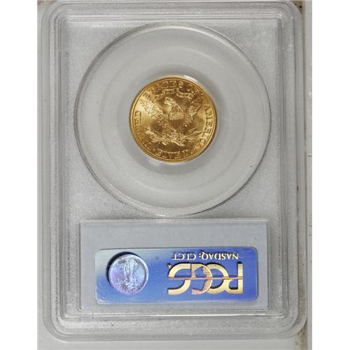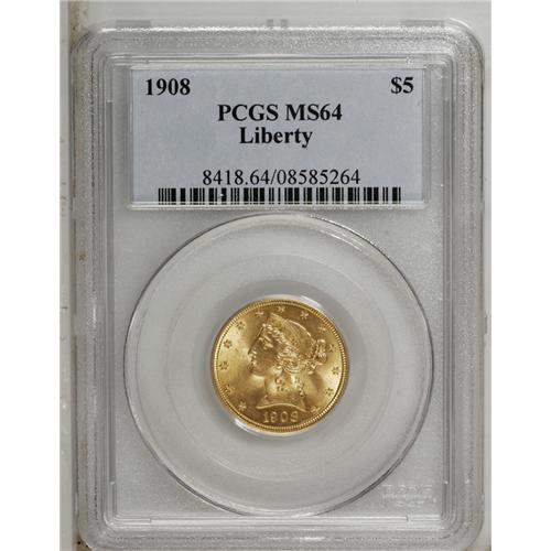 <B>1908<$5> MS64 PCGS.</B></I> A lovely butter-yellow near-Gem that has attractive luster and nicely struck devices. This farewell issue consists of more than 421,000 pieces, yet Choice and finer pieces are still elusive.