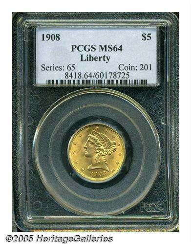<B>1908<$5> MS64 PCGS.</B></I> Sharply struck with soft, frosty yellow-gold luster and hints of pink color hidden in the devices. This Choice Mint State example is a lovely piece that will please any collector. Final year of issue for the type, and the only Liberty Head gold coin issued in 1908.