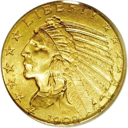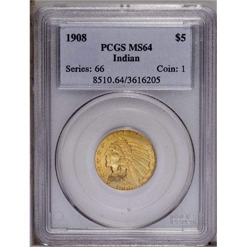 <B>1908<$5> MS64 PCGS.</B></I> The deep copper-gold surfaces offer hints of hazel in the protected areas. The strike is superior, with much more detail present than usual on the headdress. Careful scrutiny reveals a pair of light scrapes on the Indian's cheek that may have prevented a Gem ranking, and a paucity of abrasions elsewhere. <BR><BR><B>Important notice:</B> Heritage usually auctions material at the rate of 200-250 lots per hour. On some occasions eBay Live bid software or the Internet may not be able to keep up with the pace of the auction. We recommend placing a realistic absentee bid now as insurance to avoid disappointment. Occasionally the auctioneer may eliminate or reject an eBay Live bid, and the auctioneer may also reopen a lot after the close of the eBay live bidding (usually because we missed an audience bid), and may reject your bid even if it shows you as the winning bidder. By bidding via eBay Live, you agree that Heritage may award the lot to another bidder at its sole discretion under the circumstances described above or any other reasonable circumstances. Since eBay bids are not shown to us until we open the lot on the floor, we treat those bids just like floor bids. In most cases the floor responds before the eBay bid is presented to us, due to Internet lag time, so for consistency we have made it a policy that floor bids are always considered first over tie eBay live bids. Also please note that all Heritage lots purchased through eBay Live carry a 20% Buyer's Premium. Please make sure you read the Terms and Conditions before you bid. This lot is being auctioned in conjunction with a live floor auction by Heritage Galleries & Auctioneers. All final auction and invoice information will be supplied by Heritage Galleries & Auctioneers, and all other information should be considered preliminary. Lot:2865 <BR><BR><B>Winning Notification and Billing:</B> After the FINAL session in this auction is complete, Heritage will send e-mail and snail mail invoices. This process normally takes several days. All final auction and invoice information will be supplied by Heritage Galleries & Auctioneers, and all other information should be considered preliminary. <BR><BR>This auction will be conducted on a live auction floor and over the Internet through eBay Live. If you choose to place an absentee bid, please take a moment to <font color='#0000ff'><u><a href='http://pages.ebay.com/liveauctions/help/before/laabsentee.html'>learn how eBay Live absentee bidding works</a></u></font><font color='#000000'>