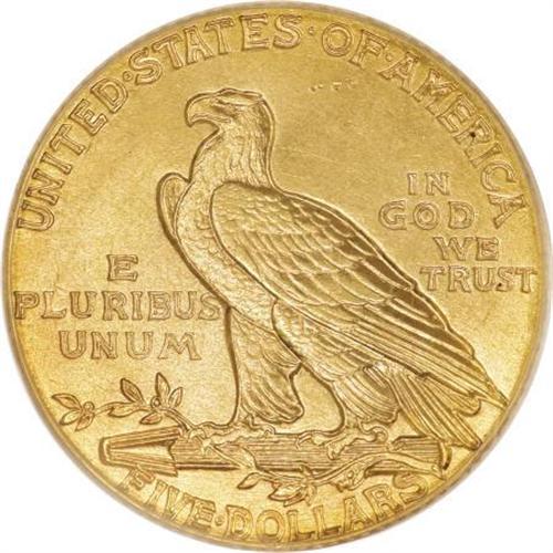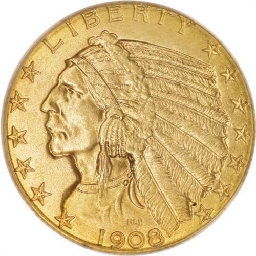 <B>1908 $5 MS64 PCGS.</B></I> A splendid first-year example of this novel recessed relief design. The orange-red surfaces shimmer with luster, and the strike is exacting, even with the intricacies of the headdress. Well preserved despite an unimportant reed mark beneath OF, and an excellent candidate for a quality gold type set.<BR><BR><B>Coin Engraver:</B> Bela Lyon Pratt<BR><BR><b>Shipping:</b> Coins & Currency (<a target="_blank" href="http://www.heritageauctions.com/common/shipping.php">view shipping information</a>)