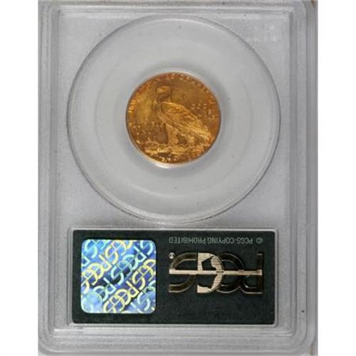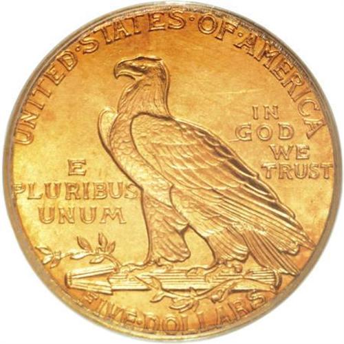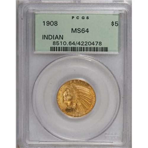 <B>1908 $5 MS64 PCGS.</B></I> This penetratingly struck near-Gem has lovely medium orange-gold toning, which deepens slightly near the rims. A small planchet flake is noted above the first T in TRUST, but the devices are immaculate and the fields are only faintly abraded. Encased in a green label holder.<BR><BR><B>Coin Engraver:</B> Bela Lyon Pratt<BR><BR><b>Shipping:</b> Coins & Currency (<a target="_blank" href="http://www.heritageauctions.com/common/shipping.php">view shipping information</a>)