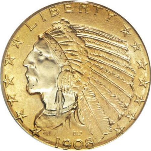 <B>1908 $5 MS64 PCGS.</B></I> Apricot-gold patina imbued with hints of light green enriches both sides of this near-Gem half eagle, the first year of the Indian Head series. A well directed strike brings out nice definition on the design features, including the bonnet feathers and the eagle's plumage. Some minute marks on the raised, exposed fields limit the grade.<BR><BR><B>Coin Engraver:</B> Bela Lyon Pratt<BR><BR><b>Shipping:</b> Coins & Currency (<a target="_blank" href="http://www.heritageauctions.com/common/shipping.php">view shipping information</a>)