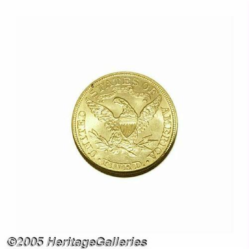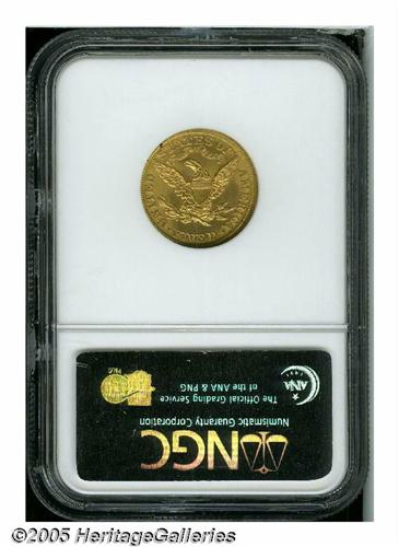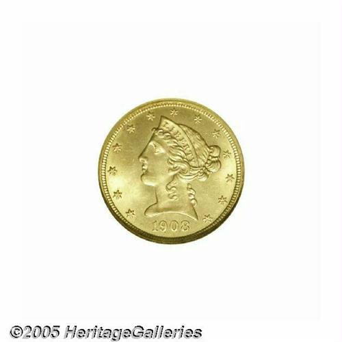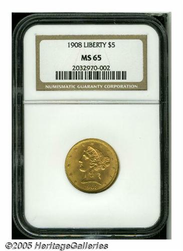 <B>1908<$5> MS65 NGC.</B></I> An important final-year issue that is often called upon for type purposes, this original example is reddish-gold in color beneath mottled, hazy overtones. The strike is free of criticism and the frosty surfaces are smooth from rim to rim. An impressive representation of Gobrecht's long-lived Liberty design.