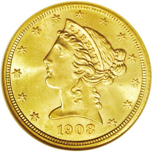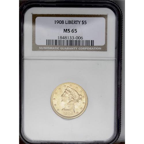 1908 $5 MS65 NGC. Fully struck with bright, shimmering 1908