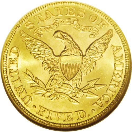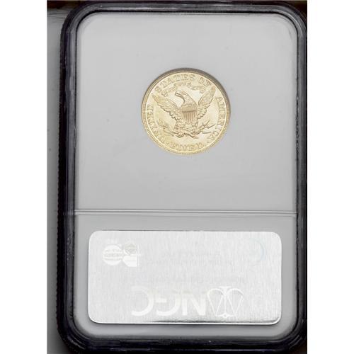 <B>1908<$5> MS65 NGC.</B></I> Fully struck with bright, shimmering, lustrous surfaces that display no obvious or overly distracting abrasions. The rich golden color is accented with a subtle hint of pale green as the coin turns under a light. Superior quality and an excellent Gem type coin from this final year of issue for the Coronet series.