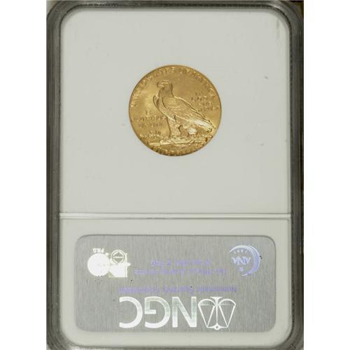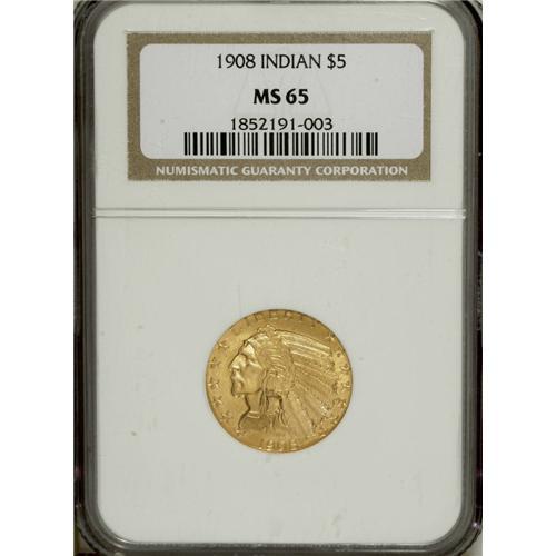 <B>1908 $5 MS65 NGC.</B></I> One of several Mint State examples of this first year Indian Head half eagle issue offered in the 2007 Central States auction. In terms of availability in high grades, the 1908 is actually one of the more common issues in this series. Better grade Mint State representatives, however, are scarce and always in demand among both date and type collectors. This boldly struck Gem displays yellow-gold surfaces that are not only sparingly abraded, but also possess a uniform radiance that adds immensely to its considerable eye appeal.<BR><BR><b>Shipping:</b> Coins & Currency (<a target="_blank" href="http://www.heritageauctions.com/common/shipping.php">view shipping information</a>)