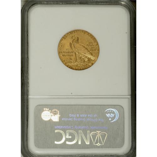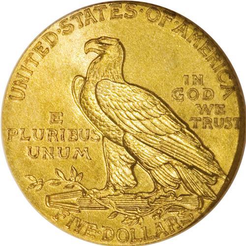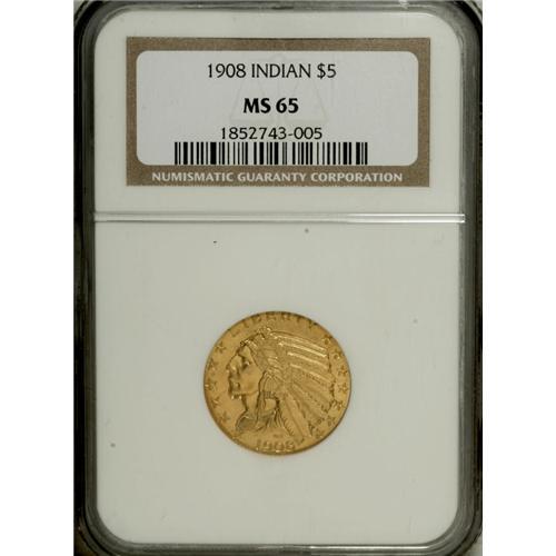 <B>1908 $5 MS65 NGC.</B></I> The Yale-educated Bela Lyon Pratt, a student of Augustus Saint-Gaudens, among others, was responsible for the novel incused-design Indian Head quarter eagles and half eagles that debuted in 1908 as part of President Theodore Roosevelt's push to implement coinage redesign. A generous mintage of 578,000 pieces, plus a collecting public that saved numerous examples as first-year issues, is responsible for most of the high grade survivors. A couple of hundred Gem pieces exist at both NGC and PCGS combined, and those examples are generally lovely and well produced. The present specimen is no exception, with lustrous orange-gold, abrasion-free surfaces. A well-struck and delightful representative of its type.<BR><BR><b>Shipping:</b> Coins & Currency (<a target="_blank" href="http://www.heritageauctions.com/common/shipping.php">view shipping information</a>)