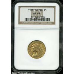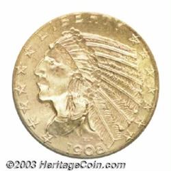 <table><tr><td><TABLE cellSpacing=0 cellPadding=0 width="100%" bgColor=#000000 border=0><TBODY> <TR><TD width="100%"><TABLE cellSpacing=1 cellPadding=3 width="100%" border=0><TBODY><TR><TD width="100%" bgColor=#79735c><FONT face=arial color=#ffffff size=3><B>Description</B> </FONT></TD></TR><TR><TD width="100%" bgColor=#ffffff><FONT face=arial size=2><B>1908 $5 MS65 NGC.</B></I> The satiny luster is typical of the issue, but the smooth, Gem quality surfaces are atypical of an Indian Half Eagle of any date. Also worthy of praise is the needle sharp strike definition that extends from rim to rim on both sides. Rich, deeply set, yellow-gold color blankets surfaces that are free of all but a few trivial abrasions. First-year type collectors who demand aesthetic appeal as well as solid technical quality would do well to enter strong bids for this lovely Gem. </FONT></TD></TR></TBODY></TABLE></TD></TR></TBODY></TABLE><BR><A name=PricesRealized></A><TABLE cellSpacing=0 cellPadding=0 width="100%" bgColor=#000000 border=0><TBODY><TR><TD width="100%"><TABLE cellSpacing=1 cellPadding=3 width="100%" border=0><TBODY><TR><TD width="100%" bgColor=#79735c><A name=PR><FONT face=arial color=#ffffff size=3><B>Previous Prices from Heritage Auctions</B> </FONT></A></TD></TR><TR><TD bgColor=#f6f6ed><TABLE cellSpacing=0 cellPadding=0 width="100%" border=1><TBODY><TR><TD align=middle width="33%"><B>Date</B></TD><TD align=middle width="33%"><B>Service</B></TD><TD align=middle width="33%"><B>Price</B></TD></TR><TR bgColor=whitesmoke><TD width="33%"><B>03/23/2003</B></TD><TD width="33%">PCGS</TD><TD width="33%">$8,912.50</TD></TR><TR bgColor=whitesmoke><TD width="33%"><B>05/31/2001</B></TD><TD width="33%">NGC</TD><TD width="33%">$9,200.00</TD></TR><TR bgColor=whitesmoke><TD width="33%"><B>08/07/1998</B></TD><TD width="33%">NGC</TD><TD width="33%">$10,925.00</TD></TR><TR bgColor=whitesmoke><TD width="33%"><B>06/01/2000</B></TD><TD width="33%">NGC</TD><TD width="33%">$8,625.00</TD></TR><TR bgColor=whitesmoke><TD width="33%"><B>08/01/1990</B></TD><TD width="33%">PCGS</TD><TD width="33%">$23,100.00</TD></TR><TR bgColor=whitesmoke><TD width="33%"><B>08/01/1990</B></TD><TD width="33%">PCGS</TD><TD width="33%">$22,000.00</TD></TR><TR bgColor=whitesmoke><TD width="33%"><B>02/01/1999</B></TD><TD width="33%">PCGS</TD><TD width="33%">$13,225.00</TD></TR><TR bgColor=whitesmoke><TD width="33%"><B>10/01/1998</B></TD><TD width="33%">PCGS</TD><TD width="33%">$13,200.00</TD></TR><TR bgColor=whitesmoke><TD width="33%"><B>01/01/1996</B></TD><TD width="33%">PCGS</TD><TD width="33%">$9,900.00</TD></TR><TR bgColor=whitesmoke><TD width="33%"><B>09/01/1999</B></TD><TD width="33%">NGC</TD><TD width="33%">$10,063.00</TD></TR></TBODY></TABLE></TD></TR><TR><TD bgColor=#ffffff><FONT face=arial size=1 ?>PLEASE NOTE: All prices realized reflect the final hammer price PLUS the buyer's premium in auctions that charge a buyer's premium. Each item has a notation at the top of the listing indicating whether that lot included a buyer's premium. Example: A item that sells with a final hammer price of $100 and a 20% buyer's premium will display with a price realized of $120. All information listed is intended to be as accurate as possible, but errors are possible. Please use this guide carefully and inform us of any inaccuracies. </FONT></TD></TR></TBODY></TABLE></TD></TR></TBODY></TABLE><BR><TABLE cellSpacing=0 cellPadding=0 width="100%" bgColor=#000000 border=0><TBODY><TR><TD width="100%"><TABLE cellSpacing=1 cellPadding=3 width="100%" border=0><TBODY><TR><TD width="100%" bgColor=#79735c colSpan=6><FONT face=arial color=#ffffff size=3><B>Price Guide*</B> </FONT></TD></TR><TR bgColor=#f6f6ed><TD align=middle><B>Grade</B> </TD><TD align=middle><B>Coin World<BR>(Trends)</B> </TD><TD align=middle><B>Numismedia<BR>Retail</B> </TD><TD align=middle><B>Numismedia<BR>Wholesale</B> </TD><TD align=middle><B>Coin<BR>Universe</B> </TD><TD align=middle><B>Heritage<BR>Value Index</B> </TD></TR><TR bgColor=#ffffff><TD align=middle>64</TD><TD align=right>$3,500.00</TD><TD align=right>---</TD><TD align=right>$2,800.00</TD><TD align=right>$2,850.00</TD><TD align=right>$2,243.50</TD></TR><TR style="FONT-WEIGHT: bold" bgColor=#cccfdd><TD align=middle>65</TD><TD align=right>$11,250.00</TD><TD align=right>---</TD><TD align=right>$9,200.00</TD><TD align=right>$12,000.00</TD><TD align=right>$8,121.25</TD></TR><TR bgColor=#ffffff><TD align=middle>66</TD><TD align=right>---</TD><TD align=right>---</TD><TD align=right>$15,000.00</TD><TD align=right>$23,500.00</TD><TD align=right>$17,201.67</TD></TR><TR bgColor=#ffffff><TD colSpan=6><FONT size=1>*All information listed is intended to be as accurate as possible, but errors are possible. No item may be returned or refused based on this information which is provided as a service to our customers. You should contact each pricing source directly to determine the accuracy of this information. </FONT></TD></TR></TBODY></TABLE></TD></TR></TBODY></TABLE><BR><TABLE cellSpacing=0 cellPadding=0 width="100%" bgColor=#000000 border=0><TBODY><TR><TD width="100%"><TABLE cellSpacing=1 cellPadding=3 width="100%" border=0><TBODY><TR><TD width="100%" bgColor=#79735c><FONT face=arial color=#ffffff size=3><B>Population Guide</B> </FONT></TD></TR><TR bgColor=#ffffff><TD align=middle><!-- Begin Output of Population Grid--><TABLE cellSpacing=0 cellPadding=0 width="100%" border=0><TBODY><TR><TD vAlign=center><TABLE cellSpacing=0 width="100%" border=1 cellsadding="3"><TBODY><TR><TD vAlign=center><TABLE cellSpacing=0 cellPadding=3 width="100%" border=1><TBODY><TR><TD vAlign=center align=middle bgColor=#f0f1e8 colSpan=2 <CENTER><FONT face=Arial size=2><B>PCGS Pop </B></FONT><CENTER></CENTER></TD><TD vAlign=center align=middle bgColor=#f0f1e8 colSpan=2><CENTER><FONT face=Arial size=2><B>NGC Pop</B></CENTER></FONT></TD></TR><TR><TD vAlign=center><FONT face=Arial size=2>(65)</FONT> </TD><TD vAlign=center align=right><FONT face=Arial size=2>133</FONT> </TD><TD 