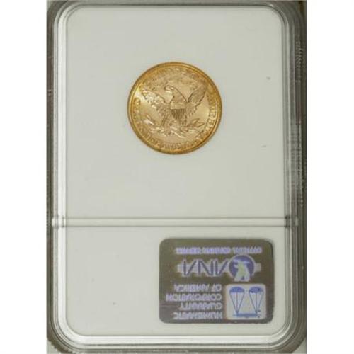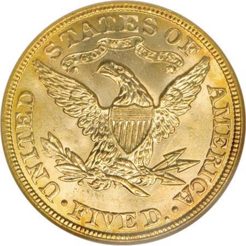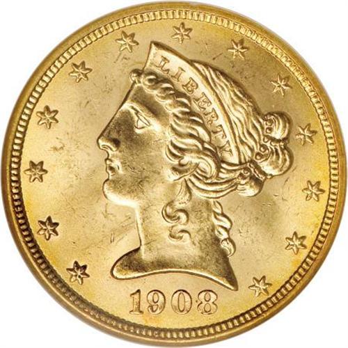 <B>1908 $5 MS65 NGC.</B></I> The 1908 Liberty Head half eagle occupies a singular niche in U.S. numismatics, as the only 1908-dated Liberty Head gold coinage and the end of the long era of the Christian Gobrecht design that began in 1838 with the eagle, 1839 with the half eagle, and 1840 with the quarter eagle. This attractive Gem offers sparkling luster over the yellow-gold, problem-free surfaces, with abundant eye appeal and a nearly full strike. NGC has certified 53 coins finer (6/07).<BR><BR><b>Shipping:</b> Coins & Currency (<a target="_blank" href="http://www.heritageauctions.com/common/shipping.php">view shipping information</a>)