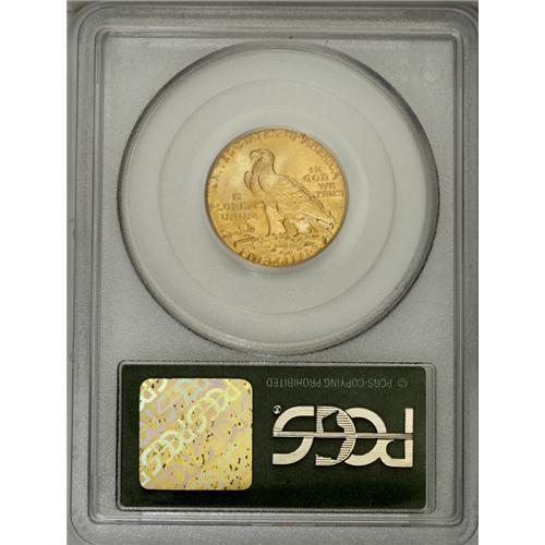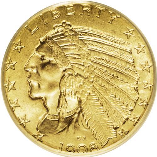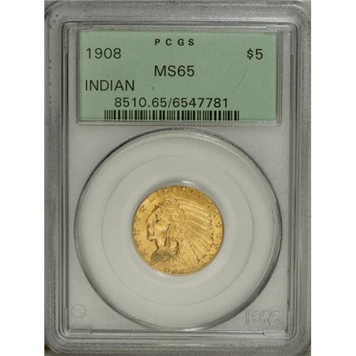 <B>1908 $5 MS65 PCGS.</B></I> The present lot combines the popularity of a first-year issue with the conditionally challenging status of the Indian half eagle series. In terms of total number of pieces known, the 1908 is actually one of the more common issues in this series. High quality representatives, however, are scarce and always in demand among both date and type collectors. This lovely Gem displays lustrous, satiny surfaces that are free of all but the most trivial abrasions. The strike is uncommonly bold for the design with full headdress and feather definition. With original orange-gold coloration, this is a difficult 1908 half eagle to surpass in terms of both technical and aesthetic appeal. PCGS has only certified 17 finer examples of this date.<BR><BR><b>Shipping:</b> Coin/Currency (<a target="_blank" href="http://www.heritageauctions.com/common/shipping.php">view shipping information</a>)