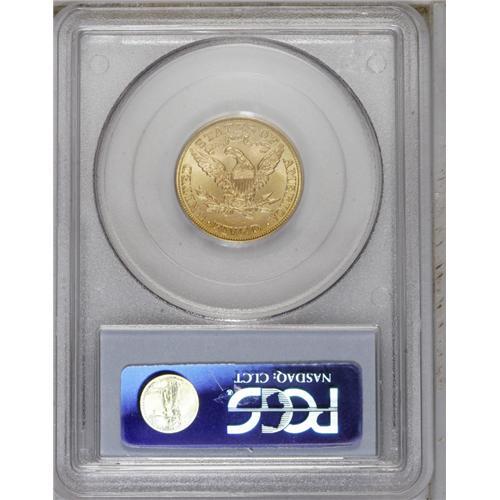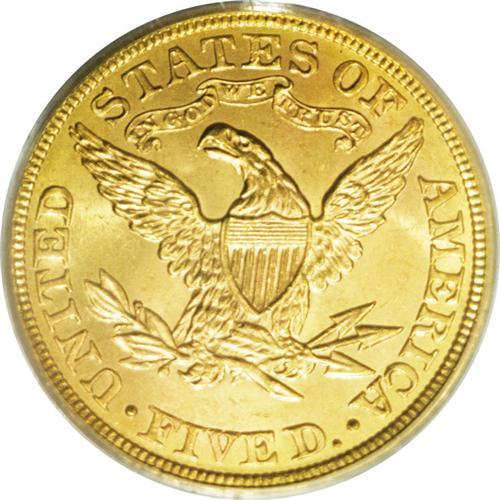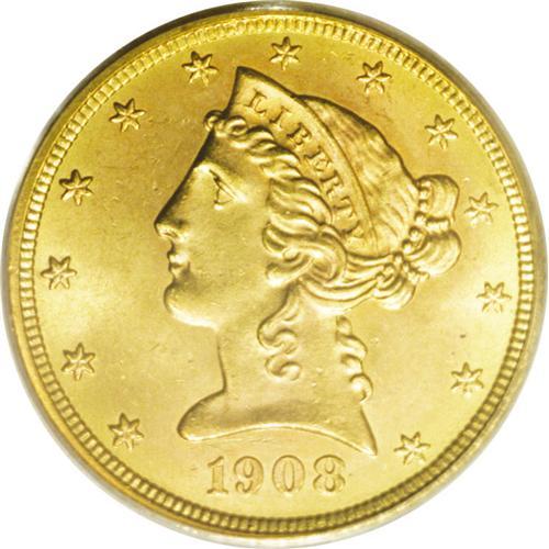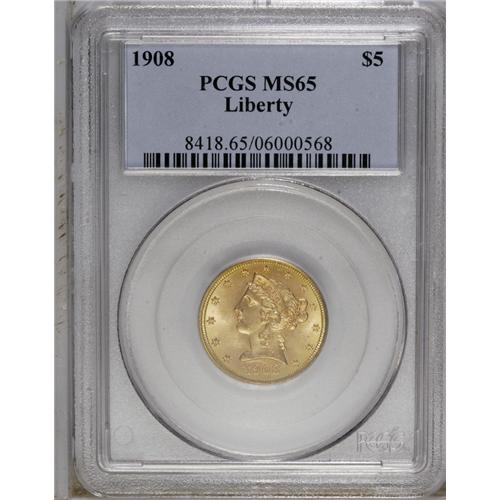 <B>1908<$5> MS65 PCGS.</B></I> This is a well balanced Gem that is boldly struck, highly lustrous, and free of significant distractions. 1908 was the final year of issue for the long-lived Liberty half eagle series. This is a common date in lower Mint State grades, becoming scarce at the Gem level of preservation.