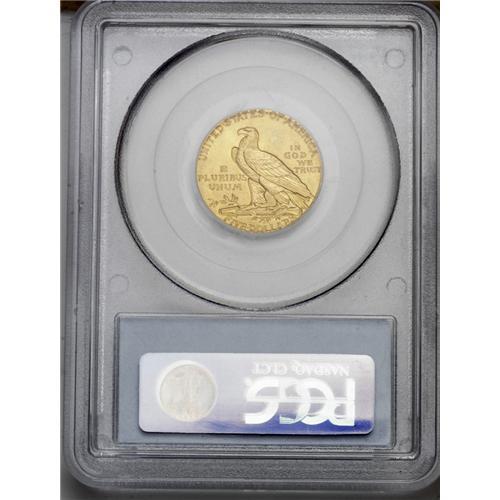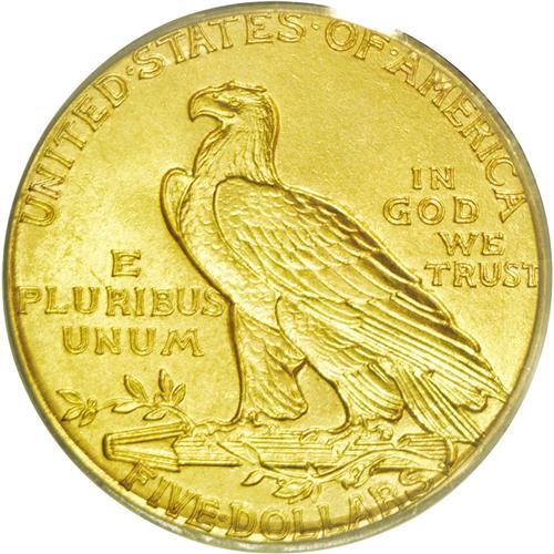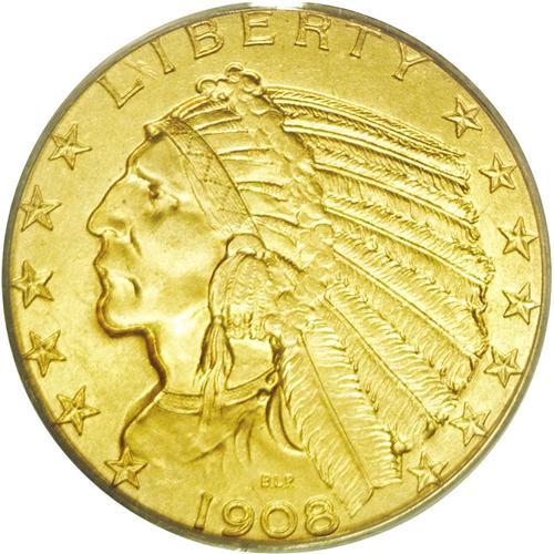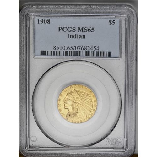 <B>1908<$5> MS65 PCGS.</B></I> This meticulously struck and lovingly preserved Gem possesses tan-golden fields with a hint of green as the coin turns under a light. Even close inspection with a loupe fails to reveal any mentionable abrasions or toning spots so common to this issue. An imposing representative of the introductory Philadelphia Mint production. Bela Lyon Pratt's recessed relief designs arrived with considerably less fanfare than the Saint-Gaudens types of the prior year. Population: 157 in 65, 16 finer (5/06).