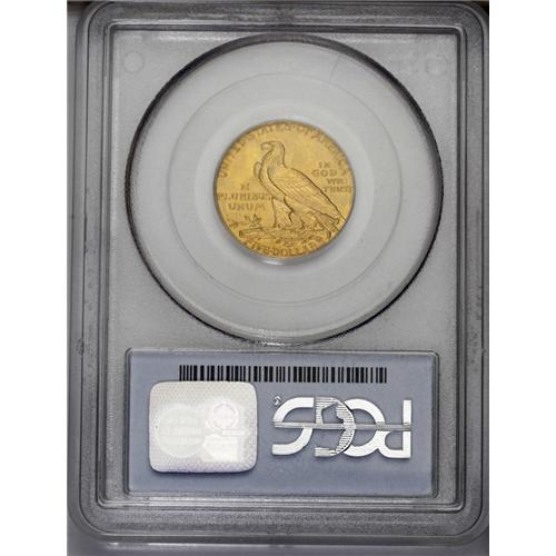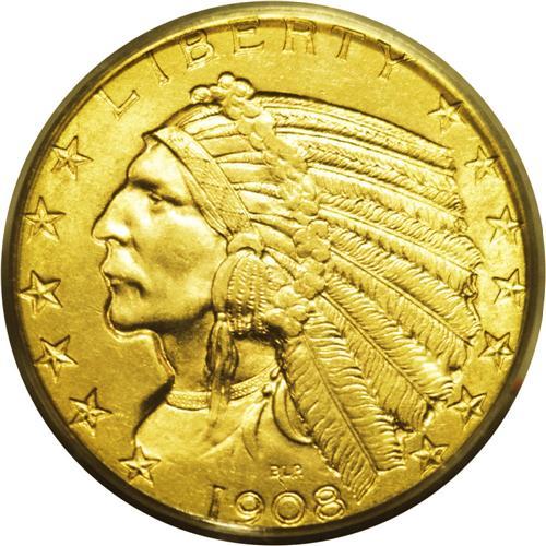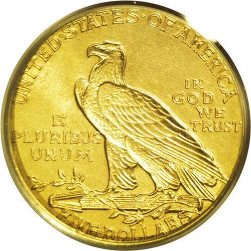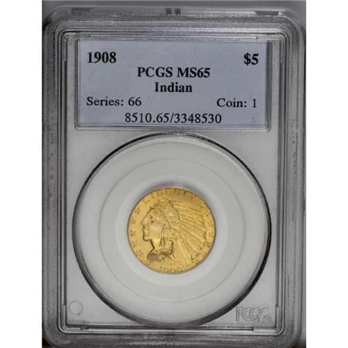 <B>1908<$5> MS65 PCGS.</B></I> Type collectors often focus on first-year and last-year issues within a given series, but oftentimes the first-year pieces, generally much more widely saved than the last-year coins, are more available--and therefore less costly in high grades--than their last-year brethren. So it is with the 1908 Indian Head issue, which is often found in lower Mint State grades, and also available in Gem condition for a price. This example offers deep, mellow orange-gold coloration with exceedingly clean devices, including the Indian's cheekbone and highpoints of the eagle, as well as pristine fields. A bit of strike weakness on the lower necklace is noted, but the overall eye appeal is extremely high, as expected for the grade. PCGS has graded 16 pieces finer (9/06). As a side note, the last-year issue, the 1929, in Gem condition would likely go for two or three times what the present piece will bring.<BR><I>From The Hamburg-Sonoma Collection.</B></I>
