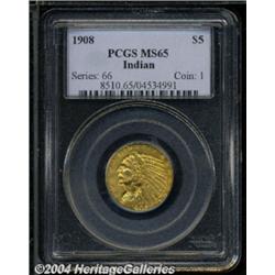 <B>1908<$5> MS65 PCGS.</B></I> An exceptionally well preserved Indian half eagle of any date, and one that is even more significant when the popularity of the first year of issue is factored in. This is a very smooth, lustrous coin that shows no variation in color and even, satiny mint luster over each side. There are no abrasions on either the obverse or reverse that one would consider worthy of individual mention. Population: 135 in 65, 12 finer (7/04). <BR><BR><B>Important notice:</B> Heritage usually auctions material at the rate of 200-250 lots per hour. On some occasions eBay Live bid software or the Internet may not be able to keep up with the pace of the auction. We recommend placing a realistic absentee bid now as insurance to avoid disappointment. Occasionally the auctioneer may eliminate or reject an eBay Live bid, and the auctioneer may also reopen a lot after the close of the eBay live bidding (usually because we missed an audience bid), and may reject your bid even if it shows you as the winning bidder. By bidding via eBay Live, you agree that Heritage may award the lot to another bidder at its sole discretion under the circumstances described above or any other reasonable circumstances. Since eBay bids are not shown to us until we open the lot on the floor, we treat those bids just like floor bids. In most cases the floor responds before the eBay bid is presented to us, due to Internet lag time, so for consistency we have made it a policy that floor bids are always considered first over tie eBay live bids. Also please note that all Heritage lots purchased through eBay Live carry a 20% Buyer's Premium. Please make sure you read the Terms and Conditions before you bid. </span></font></tr></table></td></tr></table>
