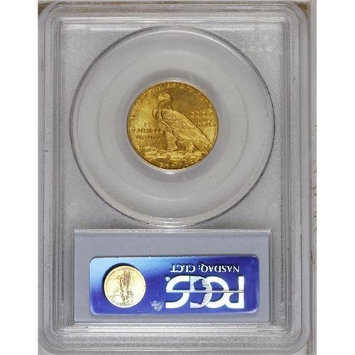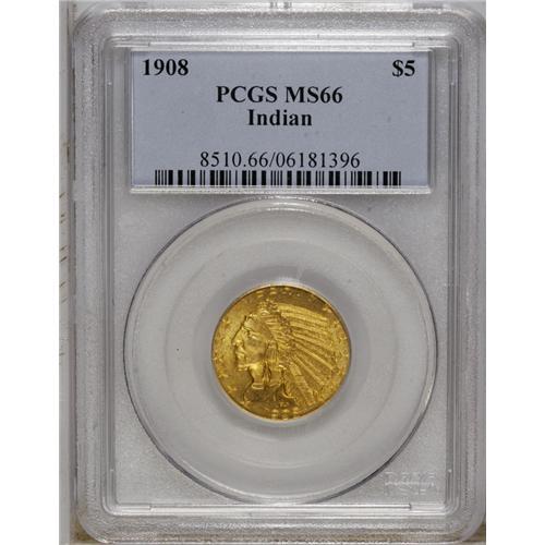 <B>1908 $5 MS66 PCGS.</B></I> 1908 was the last year that two different designs of the same gold denomination were issued for circulation. The Liberty type, the last stand of Gobrecht's once-ubiquitous motifs, was phased out in favor of Bela Lyon Pratt's incused Indian design. The reverse was similar to Saint-Gaudens' Indian eagle, but the neck was better proportioned, and the two mottos (IN GOD WE TRUST and E PLURIBUS UNUM) were switched, a necessity due to the width of PLURIBUS.<BR> This boldly impressed and nicely lustrous piece is attractively preserved, since the only apparent imperfection is a hair-thin graze through the inner point of star 3. Population: 16 in 66, 1 finer (10/06).<BR><BR><b>Shipping:</b> Coin/Currency (<a target="_blank" href="http://www.heritageauctions.com/common/shipping.php">view shipping information</a>)