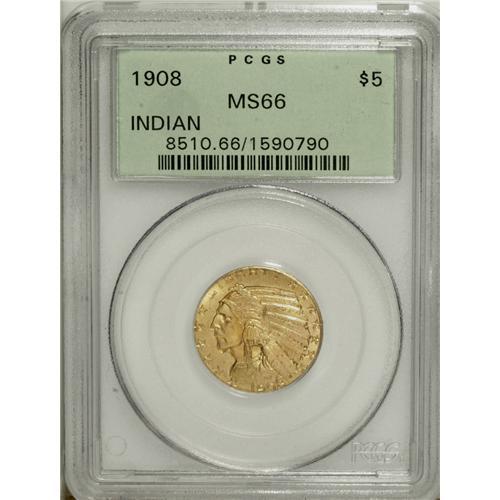 <B>1908 $5 MS66 PCGS.</B></I> First year of the new Pratt design and widely saved, presumably because of the novelty of the design as well as the radical departure from the long-lived Coronet type. The reduced relief used by Pratt on the quarter eagle and half eagle coins that began production in 1908, made the field the highpoint of the coin. As a result, the rim that formerly protected the interior designs of the coronet coinage were no longer present and the fields were susceptible to abrading from even the slightest contact. Thus, the difficulty in locating this design in Gem and better condition. This particular coin shows no obvious marks on either side and sharp striking definition. The surfaces are bright and lustrous with a lovely mixture of rose-gold and lilac color on each side. Population: 16 in 66, 1 finer (11/06).<BR><I>From The Kutasi Collection.</B></I><BR><BR><b>Shipping:</b> Coin/Currency (<a target="_blank" href="http://www.heritageauctions.com/common/shipping.php">view shipping information</a>)