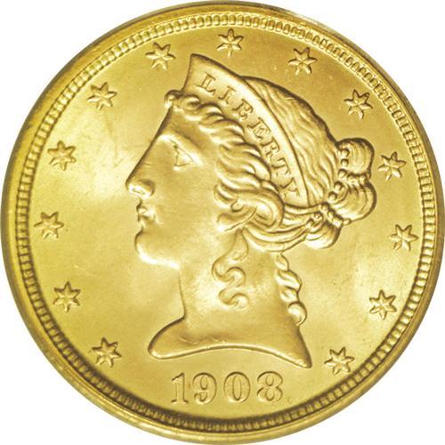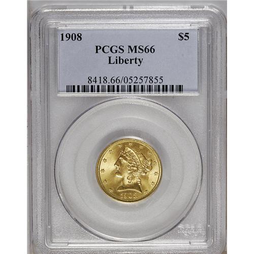 1908 $5 MS66 PCGS. Instantly and hugely appealing, thi