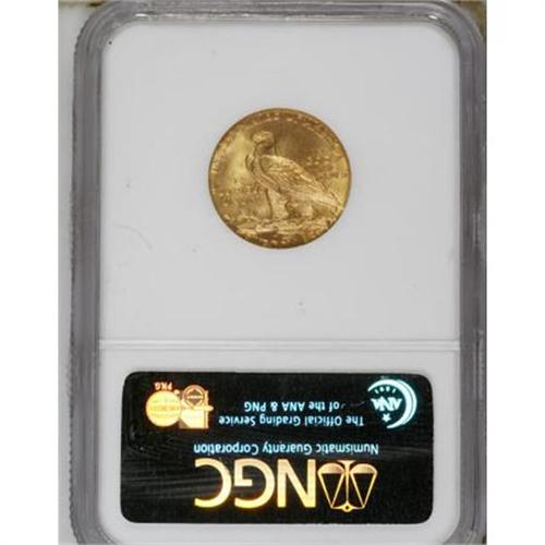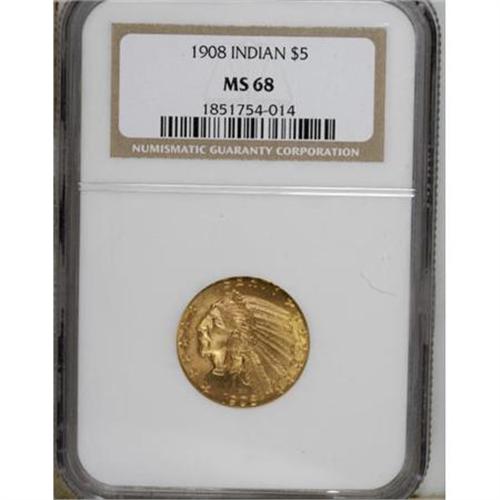 <B>1908 $5 MS68 NGC.</B></I> Early in 1908, Dr. William Sturgis Bigelow, a close friend of President Theodore Roosevelt, proposed to the President the idea of making coins with devices sunk beneath the fields; that is, with the relief designs depressed so that the highest points would not be worn away. With Roosevelt's blessing, Bigelow persuaded Boston sculptor Bela Lyon Pratt to submit models on this technique. Roosevelt enthusiastically approved the designs, and ordered that Pratt's models go to the Mint for translation into master dies, hubs, and working dies. The new design was to be used on the quarter and half eagles, both dated 1908.<BR> Pratt's design were criticized early on. One of the most vocal critics was Philadelphia coin dealer Samuel Hudson Chapman, who alleged that the designs were "antinaturalistic, unhygienic, incapable of stacking, and too easily counterfeited." Despite these objections, the designs remained without further modification, and graced both the quarter eagle and half eagle denominations through 1929.<BR> The 1908 five dollar piece, with a mintage of 577,845 business strikes, is one of the most common issues of the series, and is readily available in all grades through near-Gem. Indeed, NGC and PCGS have certified several thousand pieces through this level of preservation. The census/population figures drop significantly from this point on. In MS67, for example, a mere four examples have been seen by the two services. The MS68 specimen for sale in this lot is <I>the</B></I> only piece given the specified grade designation; no coins have been seen finer by either service.<BR> Satiny surfaces display a delicate mix of yellow-gold, mint-green, and orange color resting upon vibrant luster. A solid strike has resulted in crisp definition on the design elements, including the hair at the Indian's temple, the feathers of the bonnet, and the eagle's plumage. Close scrutiny reveals no mentionable marks on impeccably preserved surfaces. This is a wonderful, and perhaps once in a lifetime, opportunity for the connoisseur of twentieth century gold coinage to acquire the finest known example of this historic issue.<BR><BR><B>Coin Engraver:</B> Bela Lyon Pratt<BR><BR><b>Shipping:</b> Coins & Currency (<a target="_blank" href="http://www.heritageauctions.com/common/shipping.php">view shipping information</a>\)