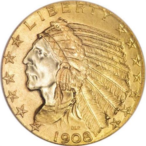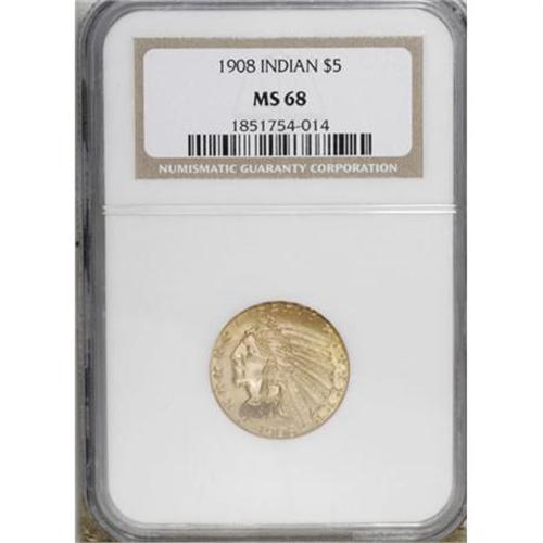 <B>1908 $5 MS68 NGC.</B></I> Early in 1908, Dr. William Sturgis Bigelow, a close friend of President Theodore Roosevelt, proposed to the President the idea of making coins with devices sunk beneath the fields; that is, with the relief designs depressed so that the highest points would not be worn away. With Roosevelt's blessing, Bigelow persuaded Boston sculptor Bela Lyon Pratt to submit models on this technique. Roosevelt enthusiastically approved the designs, and ordered that Pratt's models go to the Mint for translation into master dies, hubs, and working dies. The new design was to be used on the quarter and half eagles, both dated 1908.<BR> Pratt's design were criticized early on. One of the most vocal critics was Philadelphia coin dealer Samuel Hudson Chapman, who alleged that the designs were "antinaturalistic, unhygienic, incapable of stacking, and too easily counterfeited." Despite these objections, the designs remained without further modification, and graced both the quarter eagle and half eagle denominations through 1929.<BR> The 1908 five dollar piece, with a mintage of 577,845 business strikes, is one of the most common issues of the series, and is readily available in all grades through near-Gem. Indeed, NGC and PCGS have certified several thousand pieces through this level of preservation. The census/population figures drop significantly as the grade rises. The MS68 specimen for sale in this lot is the <I>only </B></I>1908 piece awarded that grade by either service and is one of just three coins at that level in the combined certified population for the entire series (11/07).<BR> The satiny surfaces display a delicate mix of yellow-gold, mint-green, and orange that benefits from vibrant luster. A solid strike has resulted in crisp definition on the design elements, including the hair at the Indian's temple, the feathers of the bonnet, and the eagle's plumage. Close scrutiny reveals no mentionable marks on impeccably preserved surfaces. A simply magnificent exemplar, the ultimate type coin.<BR><BR><B>Coin Engraver:</B> Bela Lyon Pratt<BR><BR><b>Shipping:</b> Coins & Currency (<a target="_blank" href="http://www.heritageauctions.com/common/shipping.php">view shipping information</a>)