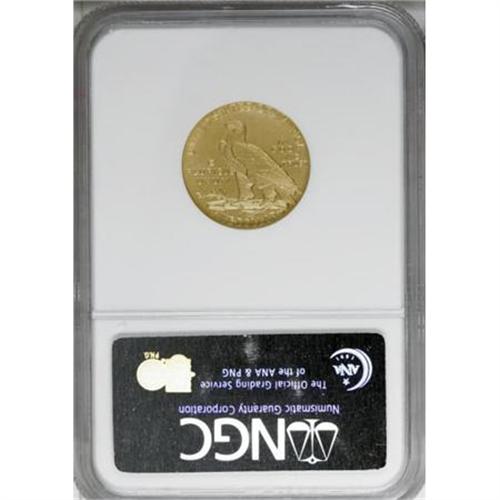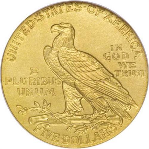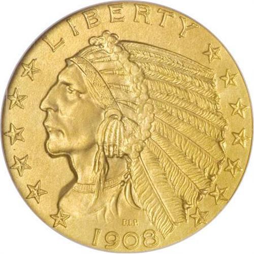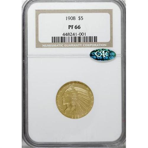 <B>1908 $5 PR66 NGC. CAC.</B></I> The Bigelow-Pratt design for the quarter eagle and half eagle was publicly commented upon by the designer at a lecture in Boston in January 1909. Part of this lecture reflects how poorly his design was received by the Mint (reminiscent of the Saint-Gaudens/Henry Hering struggles with Mint officials in 1907), and it also presents the reasoning behind the recessed relief on these coins.<BR><BR> " ... We soon knew that we had a very good design: Mr. Roosevelt said so. The models were sent to the Mint and there slaughtered after the manner in which the Mint always treats designs. They milled the edge, chopped off the margin, re-modeled the feathers and did other things ...<BR> " One of the principal advantages of this coin is that it is nearly friction proof, as nearly so as a coin can be made; the background being slightly above the level of the relief, the broad surfaces of the background taking all the wear and being perfectly smooth, the friction loss is very slight ..."<BR><BR> Collectors in 1908 received a double surprise when they ordered proof gold coins from the Mint. Not only did they receive revolutionary new designs on the quarter eagle and half eagle, but all the coins were struck with a new matte finish rather than the traditional brilliant finish. While 167 proofs seems very low by today's standards, it was almost double the number of proof fives struck the previous year. However, the new matte finish proved unpopular with collectors, and the number produced dropped to only 77 pieces in 1909. <BR> This is a splendid example of the matte proofing process. The surfaces are deep in color and show the coarse granularity proofs from this year are known for. The only surface disturbance of consequence is a hairline-thin mark across the cheek of the Native American. An exceptionally pleasing example of this first-year issue.<BR><I>From The Southwest Collection.</B></I><BR><BR><B>Coin Engraver:</B> Bela Lyon Pratt<BR><BR><b>Shipping:</b> Coins & Currency (<a target="_blank" href="http://www.heritageauctions.com/common/shipping.php">view shipping information</a>)
