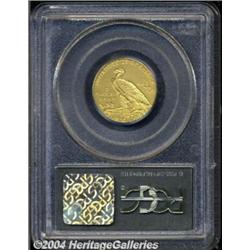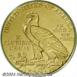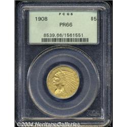 <B>1908<$5> PR66 PCGS.</B></I> Absolutely stunning quality in a matte proof gold coin--the surfaces appear to be perfectly preserved. There is a shallow depression on the reverse behind the eagle's head, but this appears to have been struck into the coin as matte granules overlay this thread-like "defect." Otherwise, we see no shiny spots or abrasions on either side.<BR> Always popular as the first year of issue, it is reported that 167 proofs were struck of the 1908 half eagle. However, it is not clear that all these were distributed; and in fact, it is certain that an unspecified number were melted on January 2, 1909 after 100 gold proof sets were assembled. Despite the relatively high mintage and number of proof sets assembled, the 1908 five dollar does not appear to be significantly more available than other dates in the series. We estimate that perhaps 40-55 pieces may still be extant in all grades. Of that number few can rival the technical preservation and overall eye appeal of this magnificent coin. Population: 12 in 66, 2 finer (3/04). <BR><BR><B>Important notice:</B> Heritage usually auctions material at the rate of 200-250 lots per hour. On some occasions eBay Live bid software or the Internet may not be able to keep up with the pace of the auction. We recommend placing a realistic absentee bid now as insurance to avoid disappointment. Occasionally the auctioneer may eliminate or reject an eBay Live bid, and the auctioneer may also reopen a lot after the close of the eBay live bidding (usually because we missed an audience bid), and may reject your bid even if it shows you as the winning bidder. By bidding via eBay Live, you agree that Heritage may award the lot to another bidder at its sole discretion under the circumstances described above or any other reasonable circumstances. Since eBay bids are not shown to us until we open the lot on the floor, we treat those bids just like floor bids. In most cases the floor responds before the eBay bid is presented to us, due to Internet lag time, so for consistency we have made it a policy that floor bids are always considered first over tie eBay live bids. Also please note that all Heritage lots purchased through eBay Live carry a 20% Buyer's Premium. Please make sure you read the Terms and Conditions before you bid. </span></font></tr></table></td></tr></table>