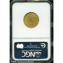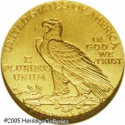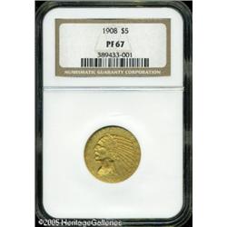 <B>1908 $5 PR67 NGC.</B></I> Soon after Augustus Saint-Gaudens redesigned the eagle and double eagle in 1907, Bela Lyon Pratt was chosen to prepare new designs for the two smaller denomination gold coins. His unique design was a first in American coinage history. While the actual design itself is raised, as on other coins, the entire design was sunken below the surfaces of the surrounding fields, thus it is often called an "incuse" design, which is partially correct. This unusual design gave an entirely different look to the coinage, and it served other functions as well. For business strikes, wear patterns were different with the fields offering protection to the high points of the design. It also provided a different pattern of metal flow during the striking process. Proof examples of this design, as with all gold coins of this era, were struck in different experimental finishes.<BR> The 1908 half eagle Proofs, of which perhaps 100 or so were distributed, have a light to dark matte finish. Walter Breen claimed that these coins have a dark matte finish, although this example is lighter yellow in color. The original mintage of these coins is generally considered to be 167 coins, per the listing in the <I>Guide Book</B></I> and other sources, although a 1936 publication by Charles Green suggests that a number of these were melted in early 1909 after remaining on hand in the Mint "Inventory" of proof gold coinage. The resulting "net" mintage or quantity distributed was less than 100 coins, according to this source.<BR> This example is one of three different PR67 examples that we have offered over the last dozen years, and it represents the fifth time that one of the three has been offered by us. The surfaces are exquisite with smooth light to medium yellow color and a matte or sandblast finish, limiting the intensity of the luster. As expected, every design element is bold and crisp. A couple tiny surface marks are noted, but there do not appear to be any actual grazes in the surfaces of either side. A short, microscopic black line is located in the reverse field above the middle of the wing. This is the only individual characteristic that we can find to provide for tracing of the pedigree. NGC has only certified one finer example of this issue. Population: 8 in 67, 1 finer (1/05). Lot:8712