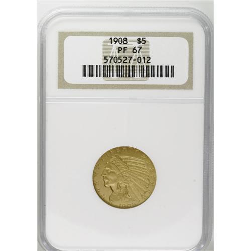 <B>1908 $5 PR67 NGC.</B></I> There were few proof gold collectors in 1908. Only 167 proof half eagles were struck, an increase from the 92 proofs produced the prior year. The 1908 quarter eagle had a comparable increase in proof mintage from its 1907 predecessor. The cause for the additional pieces struck was presumably the new designs by Bela Lyon Pratt. These replaced the long-lived Liberty types, which had been struck throughout the entire lifetime of most collectors of the era.<BR> Some who ordered the new Indian half eagle proofs were surely surprised when they received and examined their specimens. Unlike prior designs, the devices were sunken into the field, with the highpoints at the same level as the field. These designs are often referred to as incuse, but this is a misnomer, since an incuse design would have opposite relief, with areas such as the cheekbone the lowest point of the design, instead of the highest. The proof finish of the Indian half eagle was also dramatically different than the Liberty type. Proof Liberty half eagles have mirrored fields and (at times) frosty devices, similar to the proof gold American Eagles in production today. The proof Indian and Saint-Gaudens types are matte proofs, with the same microgranular finish on both the fields and devices.<BR> Proof Indian half eagles are easily distinguished from their business strike counterparts. The color is comparatively dark, since the fields lack reflectivity, and luster is diffused. Since the pieces were well made, the abrasions that plague bag-stored business strikes are absent on proofs. Finally, the proofs are nearly fully struck, the extra detail most noticeable on the eagle's shoulder and the lower reaches of the headdress. The present piece shows all of these characteristics, and is essentially perfect, save for a tiny mint-made planchet flaw located directly beneath, but relatively distant from, the U in TRUST. This minuscule flaw serves as an identifier for any auction appearances.<BR><I>From The Dr. Robert J. Loewinger Collection.</B></I><BR><BR><b>Shipping:</b> Coin/Currency (<a target="_blank" href="http://www.heritageauctions.com/common/shipping.php">view shipping information</a>) <BR><BR><B>Import