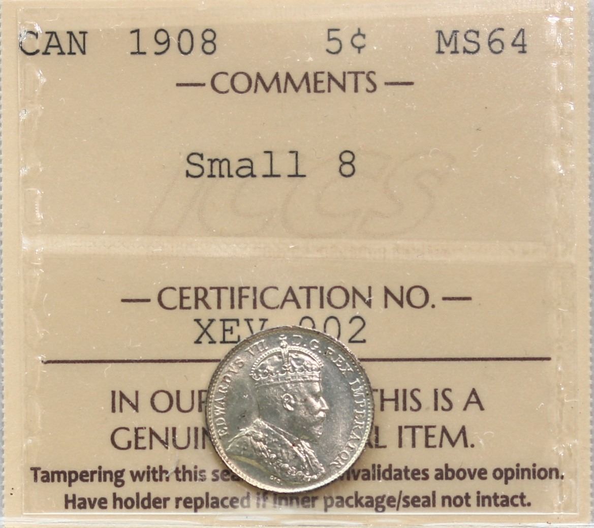 1908 5¢ "Small 8" ICCS Choice Mint State-64 Blast white example.