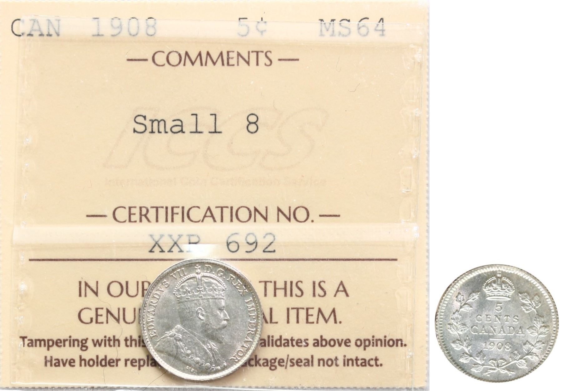 1908 5¢ "Small 8" ICCS Very Choice Mint State-64, Brilliant and lustrous.