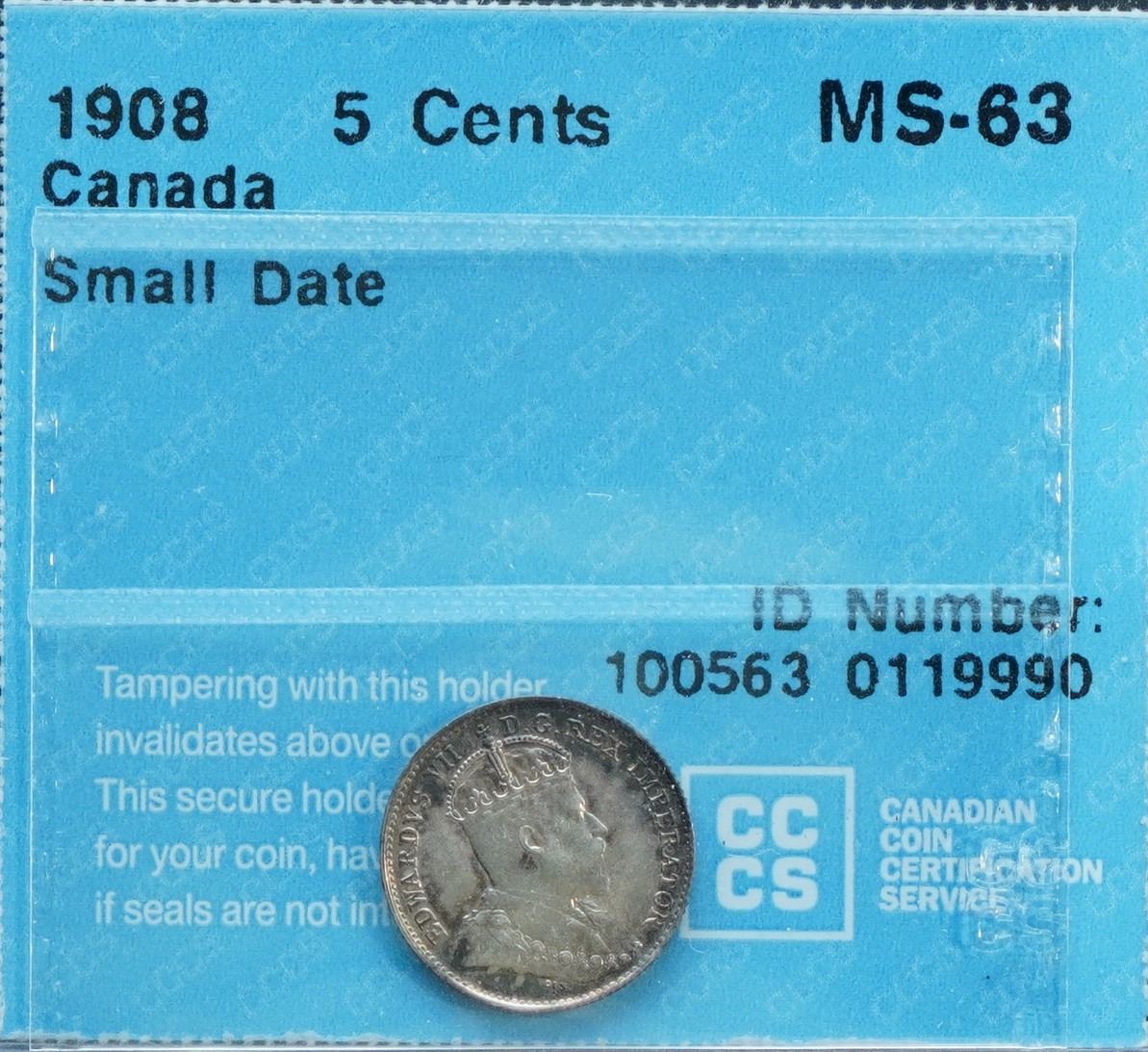 1908 5¢ Small Date CCCS Choice Mint State-63.
