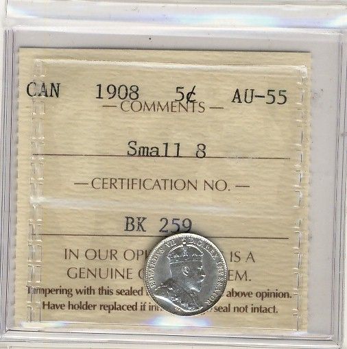 1908 5¢ Sml 8 ICCS AU55. Lustrous white.