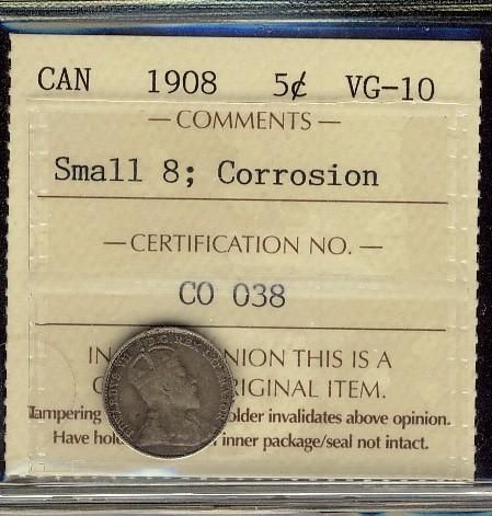 1908 5¢ Sml 8 ICCS VG10. Designated, corroded.