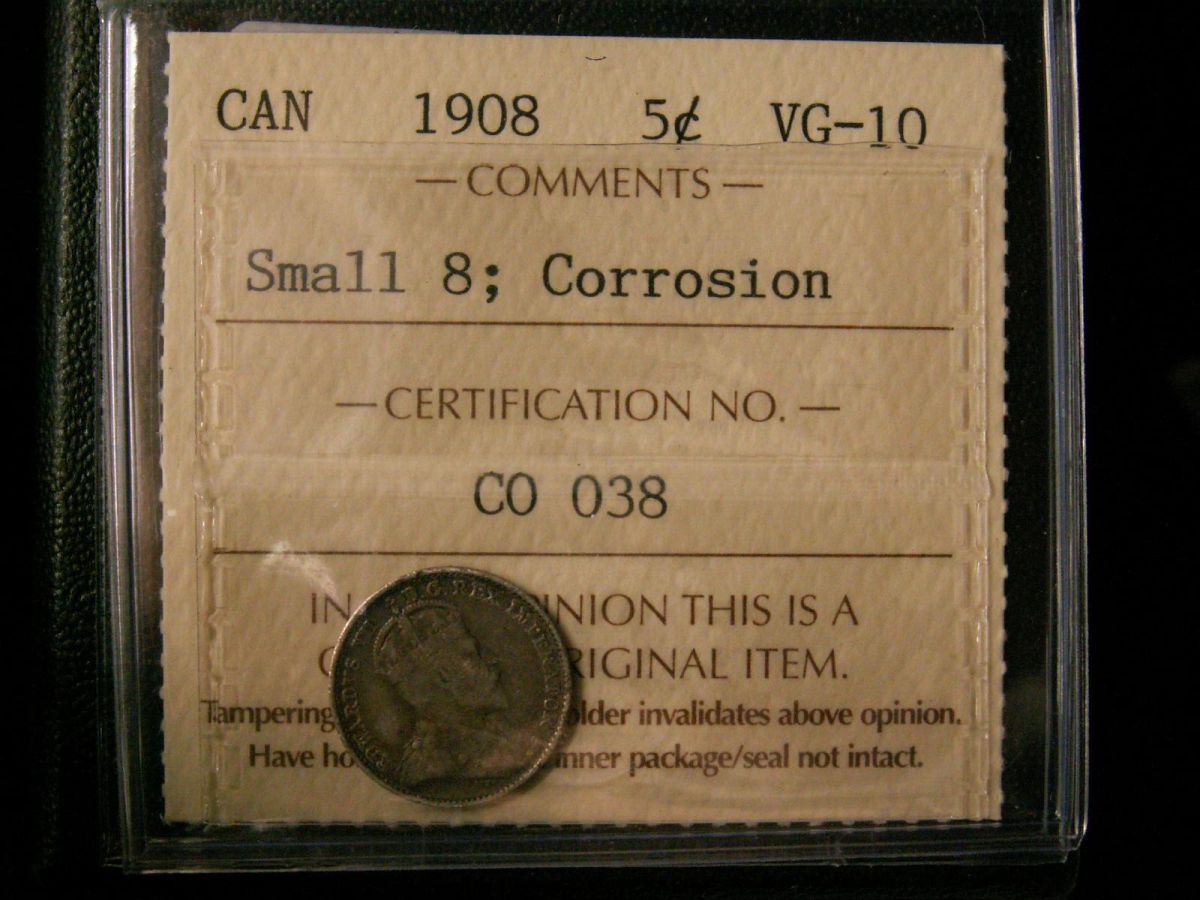 1908 5¢ Sml 8 ICCS VG10. Designated, corroded.