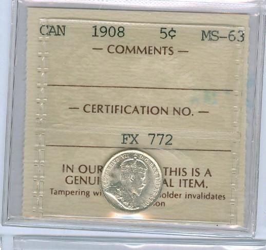 1908 5¢ Sml date ICCS MS63. Superb blast white example.