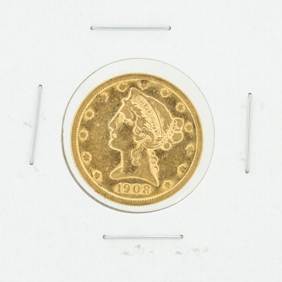 One 1908 $5 VF Liberty Head Half Eagle Coin.