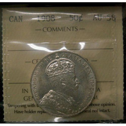 1908 50¢ ICCS AU-58 A nice example with problem free. Lots of lustre