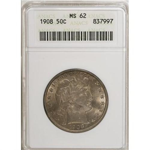 <B>1908 50C MS62 ANACS.</B></I> . NGC Census: (21/70). PCGS Population (17/84). Mintage: 1,354,545. Numismedia Wsl. Price for NGC/PCGS coin in MS62: $500. (#6512)<BR><BR><B>Coin Engraver:</B> Charles E. Barber<BR><BR><b>Shipping:</b> Coins & Currency (<a target="_blank" href="http://www.heritageauctions.com/common/shipping.php">view shipping information</a>)